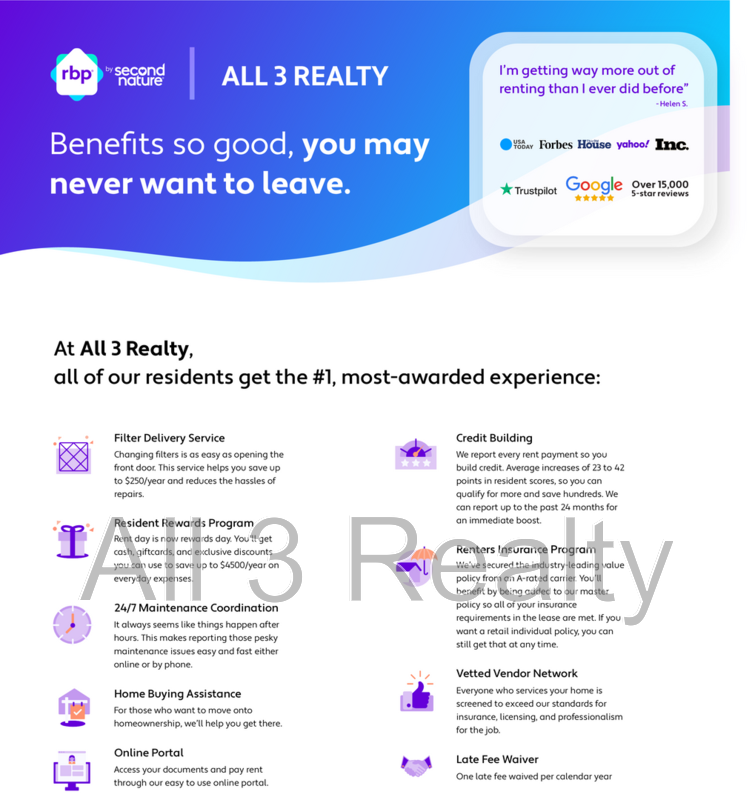 All 3 Realty residents are enrolled in the Resident Benefits Package (RBP) for $35/month which includes liability insurance, credit building to help boost the resident’s credit score with timely rent payments, HVAC air filter delivery (for applicable properties), our best-in-class resident rewards program, and much more! More details upon application.